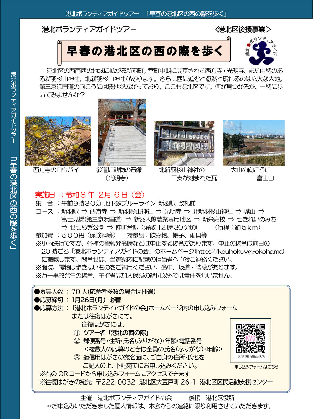 港北ボランティアガイドの会は、来月(2026年)2月6日(金)午前に港北区内の都筑区との区境付近でウォーキングツアー「早春の港北区の西の際を歩く」を企画し、参加者70人を1月26日(月)まで募集しています。