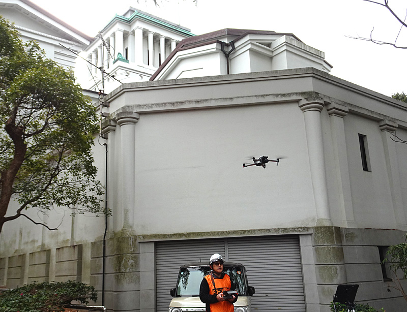 ドローンなどを使った建物の診断と新たな維持管理の方法を研究するため今年(2026年)1月から本格活動をスタートした「建物デジタル診断研究会」(事務局:新横浜2、内山岳彦代表)と公益財団法人大倉精神文化研究所(大倉山2)が共同で実施するものです。