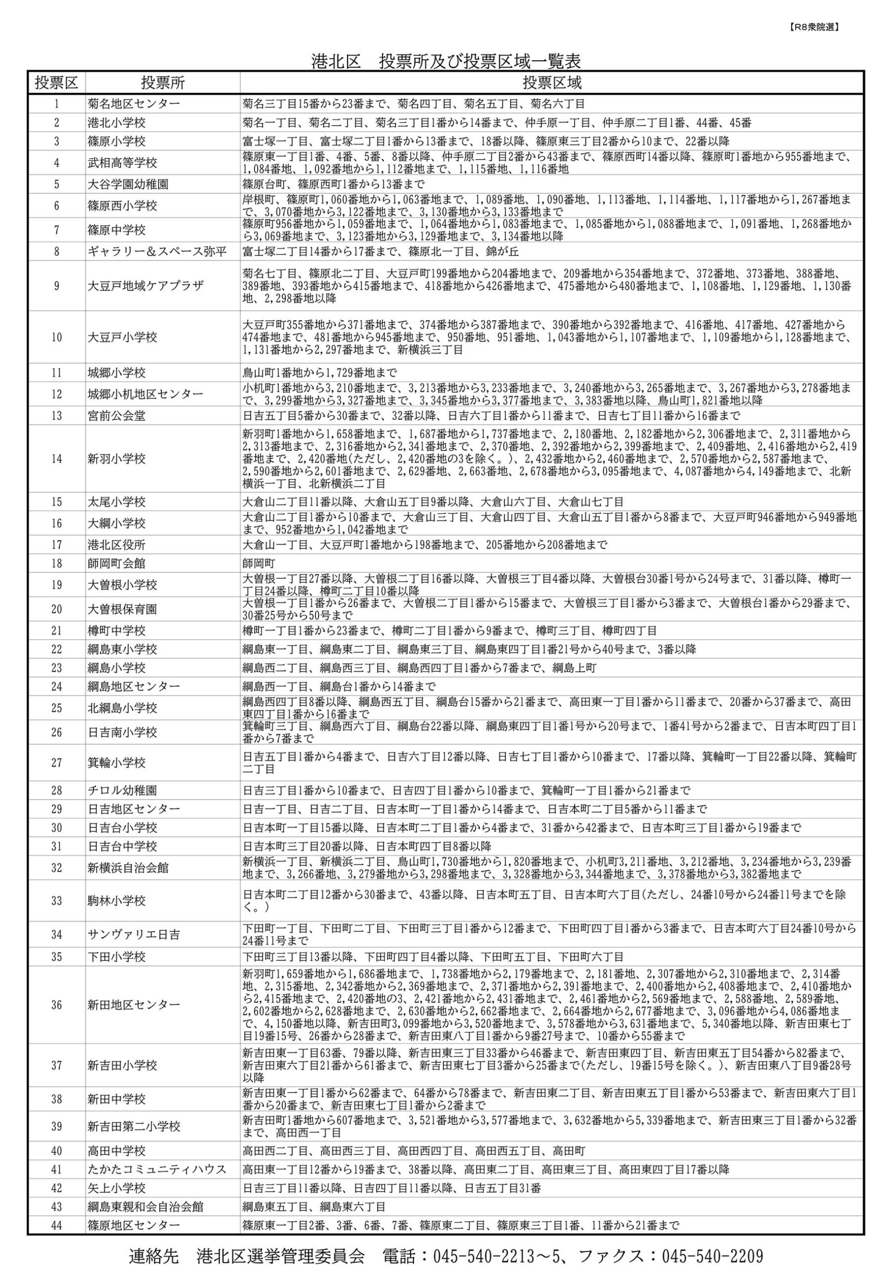 ・港北区内の「投票所(住所からさがす)」(44カ所、居住地ごとに異なる)