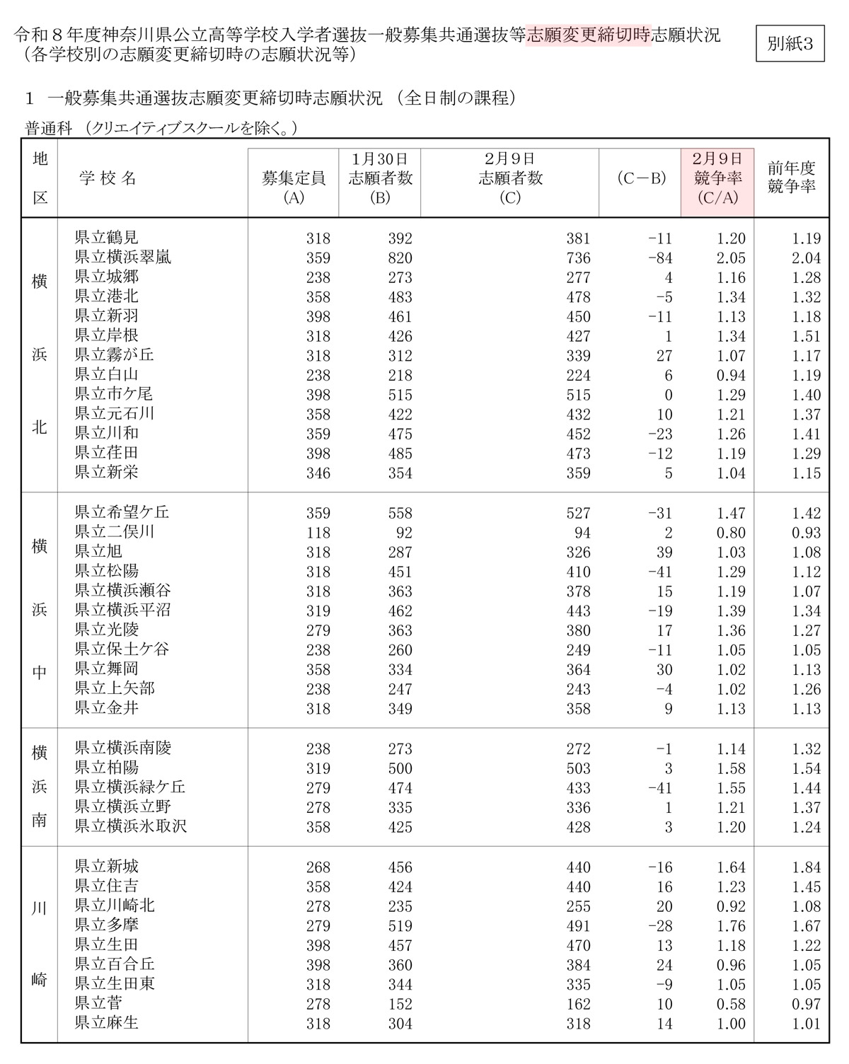きょう(2026年)2月9日(月)夜に神奈川県教育委員会から志願変更期間を踏まえた新たな志願者数と競争倍率が発表され、港北区など北部6区の「横浜北地区」(鶴見・神奈川・港北・緑・青葉・都筑)の公立高校でも変動がありました。