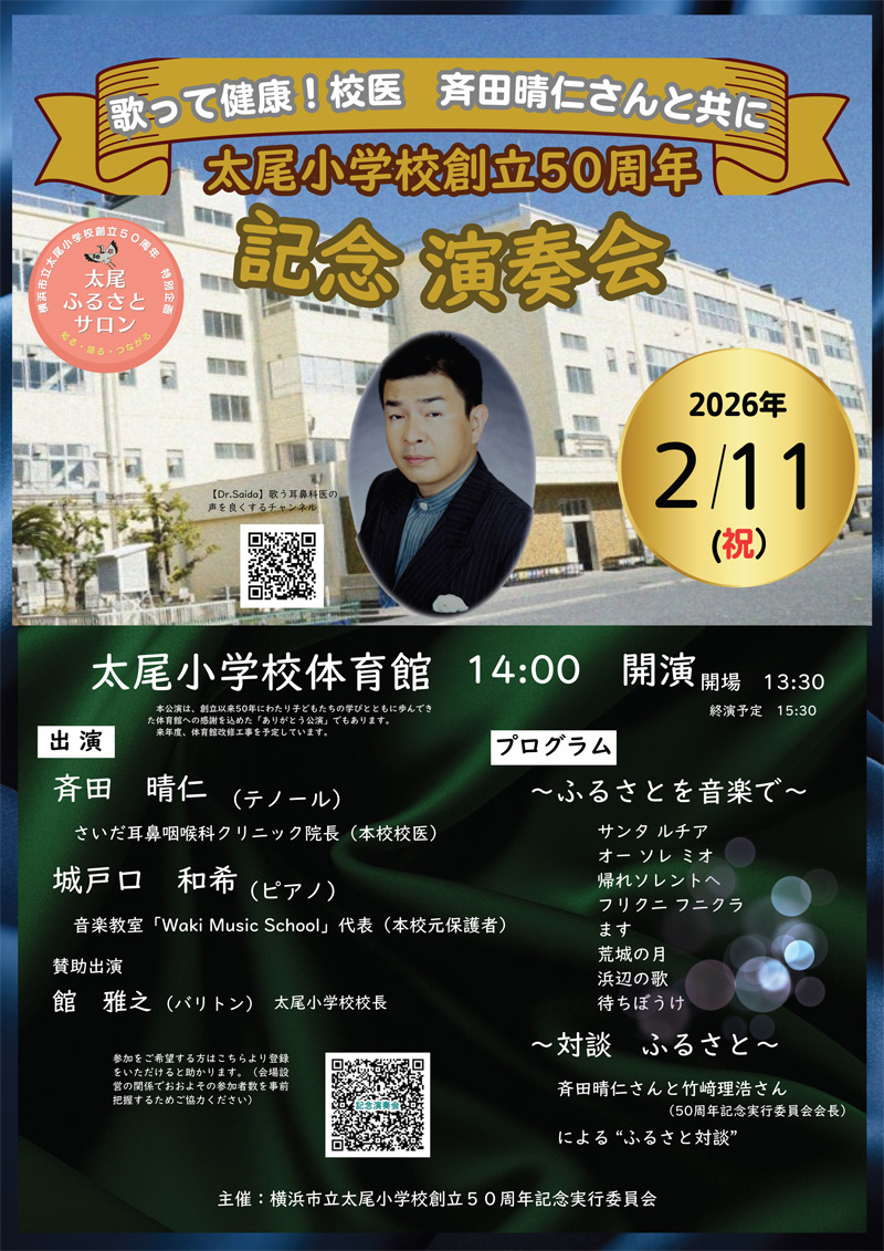 実行委員会の竹﨑理浩会長(学校運営協議会会長・大倉山地区連合町会・太尾親和町会会長)と斉田さんが「ふるさとを語る」対談コーナーも予定されており、“ふるさと太尾”を体感できる50周年事業のフィナーレを彩るイベントらしい“ふるさとへの想い”を共有できる時間を楽しみにしたいところです。