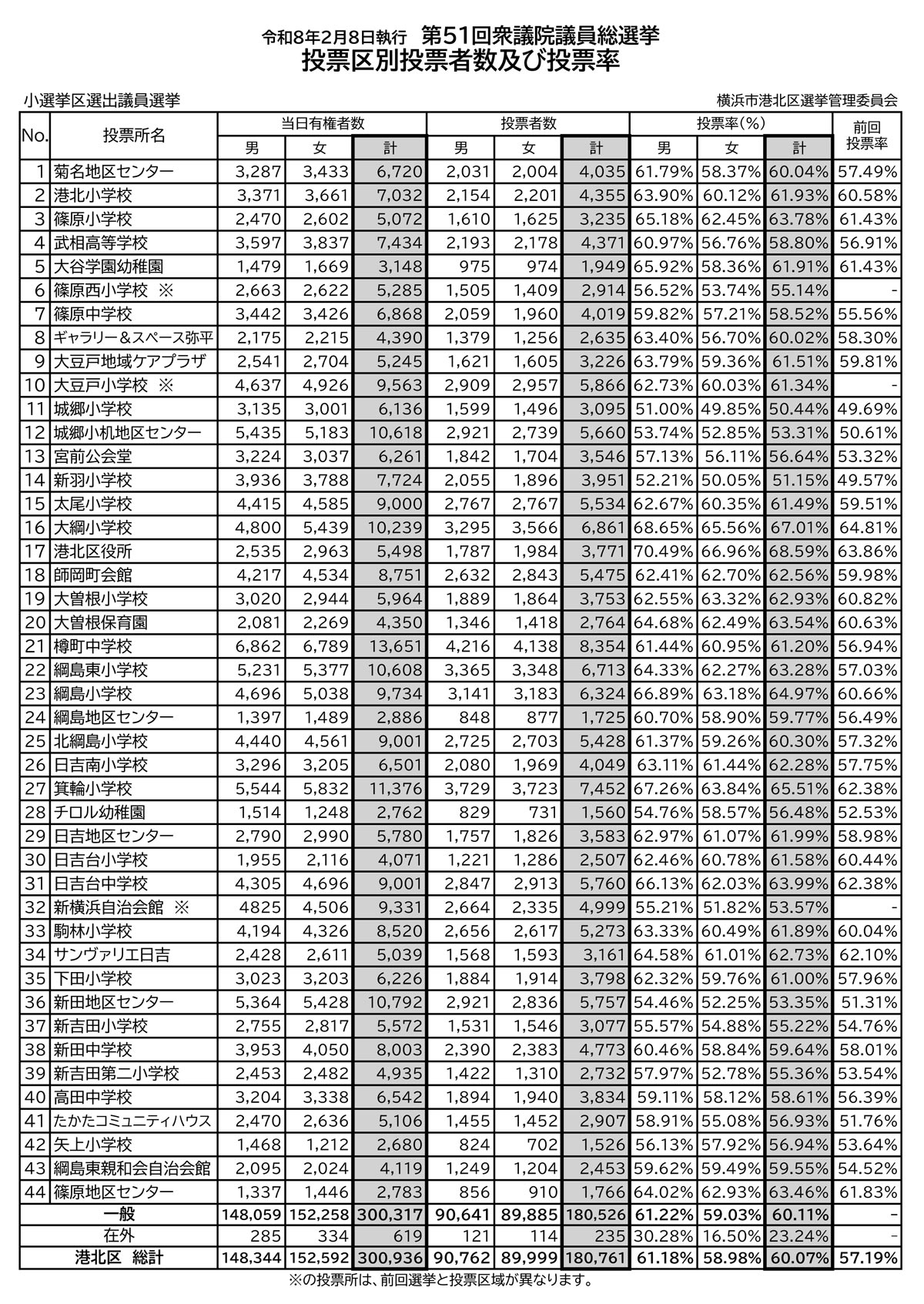 先週(2026年)2月8日に投票が行われた衆議院議員総選挙で、港北区内に設けられた「投票所」44カ所ごとの投票率(神奈川7区=小選挙区分)が発表され、大倉山や日吉、綱島の投票所で高い傾向が見られました。