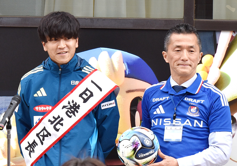 港北区の一日区長は、日産スタジアムをホームとしている縁から2011(平成23)年度からF・マリノスの選手が定期的につとめており、古くは区内出身の富澤清太郎選手(2022年現役引退)や富樫敬真(けいまん)選手(現「アトランタ・ユナイテッド(北米)」所属)などが担当し、近年は喜田拓也選手や宮市亮選手ら現在の主力選手も就任しています。