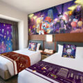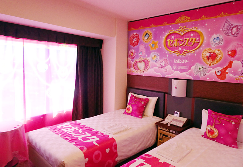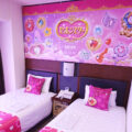 高層部の31階にある「スカイビューツインルーム」を使って設けられたコンセプトルームは、カーテンや壁、鏡、クッション、フットスロー(ベッドの足元部分にかけられている細長い布)といった部分まで、セボンスターの玩具が醸し出す“キラキラ”の世界観を表現。