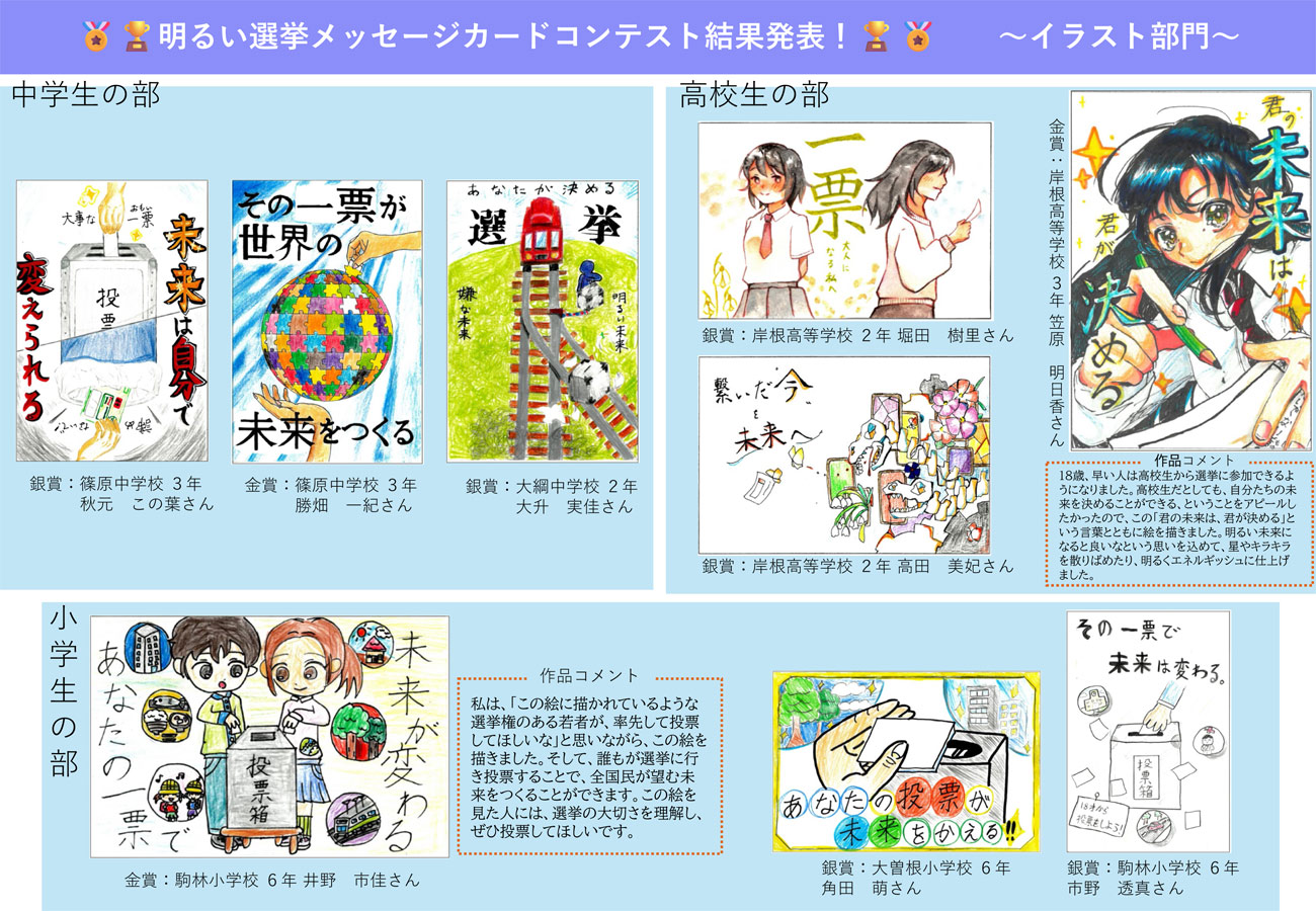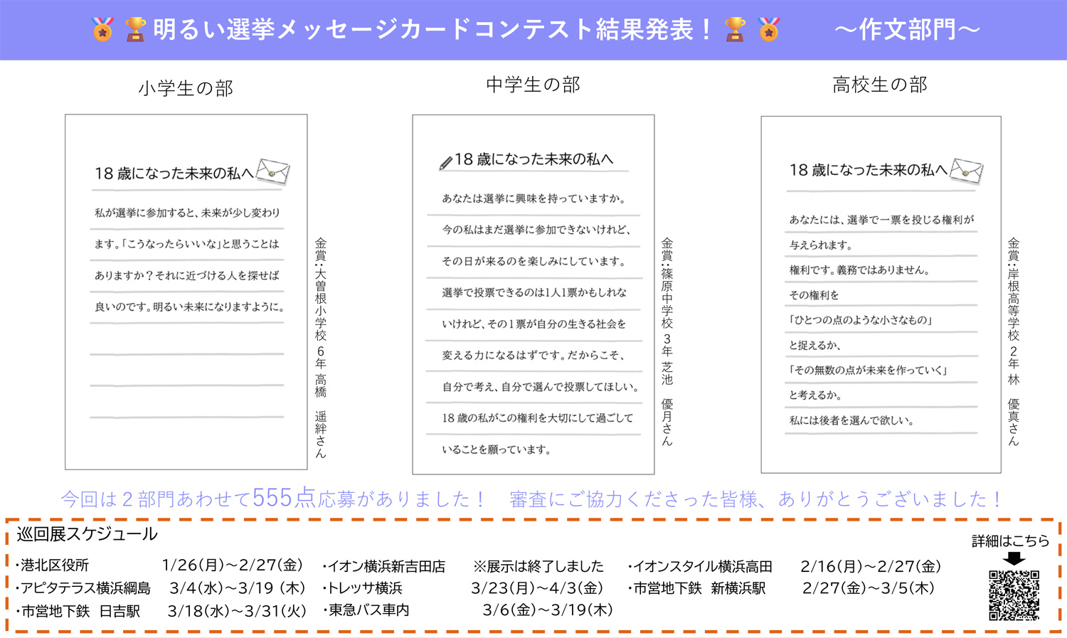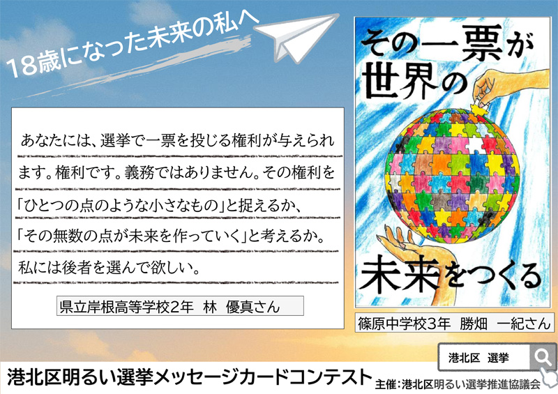 ・「明るい選挙メッセージカードコンテスト 入賞作品」の紹介ページ&巡回展の案内(「港北区明るい選挙推進協議会」事務局、巡回展の予定はページ下部に掲載)