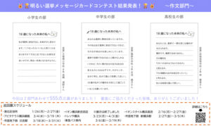 今年度は「18歳になった未来の私へ」をテーマに港北区内の小・中学校と高校へ通う児童・生徒からイラストメッセージと作文メッセージの計555点におよぶ応募があり、そのなかから入賞作品を展示するものです。