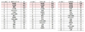 左から「一般オフィスワーカー」「DX人材」「就活生(就職活動中の学生)」それぞれの働きたい街ランキング(トップ15エリア)、1位に選ばれた街は2ポイント、2位に選ばれた街は1ポイントとして計算しランキング化(三菱UFJ信託銀行「働きたいオフィス・働きたい街ランキング2026」調査結果の詳細より)