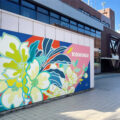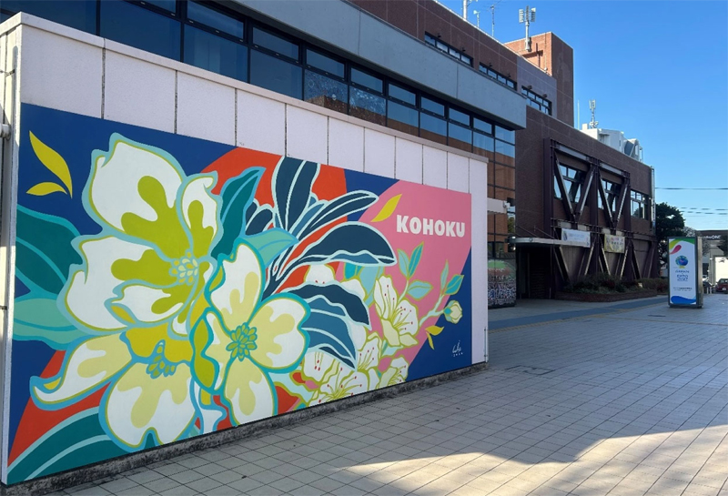 昨年(2025年)秋に開催された大型イベント「新横浜パフォーマンス」(新横浜町内会主催)でのメインイラスト(メインビジュアル)を担当した小野留依聖(Luise Ono=オノ・ルイーゼ)さんが、港北区の木(ハナミズキ)と花(ウメ)をモチーフに取り入れ、港北区の特色を感じられるデザインとして仕上げた作品を、現地で壁画として描くスタイルでの設置作業を行ってきたといいます。