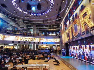 「LIVE FOOD HALL(ライブ・フード・ホール)」と名付けてビジョンを取り囲むようにテーブルやシートを設け、その背後には9つの飲食販売店が並びます。