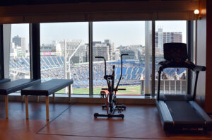 トレーニングマシンや低酸素環境といった設備面だけでなく、ホテルのような環境を志向し、ロート製薬が「集中力や活力を高める空間」を目的に開発した香りで演出。眼下に横浜スタジアムを一望しながらトレーニングできる環境も注目です。