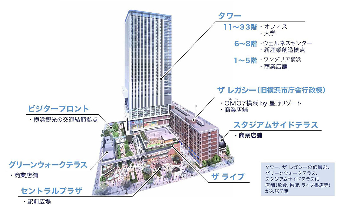今から6年前の2020年4月、関内に置かれていた横浜市役所がみなとみらい線・馬車道駅前へ移ったことを機に、三井不動産をはじめ、鹿島建設、京浜急行電鉄、第一生命保険、竹中工務店、ディー・エヌ・エー(DeNA)、東急、星野リゾートの8社によって跡地(約1万6500平方メートル)の再開発が行われていたものです。