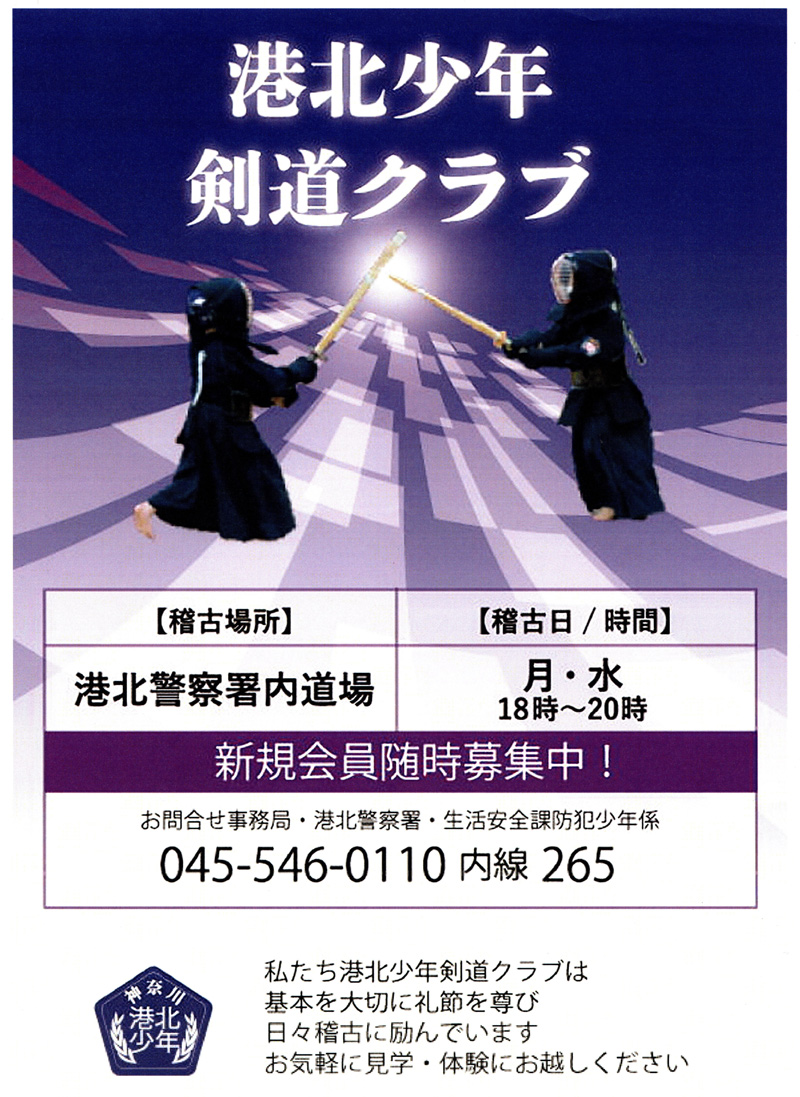 1985(昭和60)年4月創立、港北警察署(港北署、大豆戸町)内の道場で活動を行う「港北少年剣道クラブ」(鈴木絵理会長)は、今週(2026年)4月11日(土)14時から16時まで(13時50分受付開始)、主に小学生を対象とした「剣道体験会」(参加費無料)を開催します。