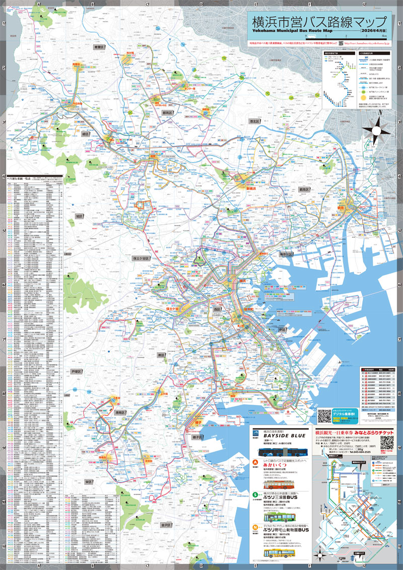 全系統を掲載した路線マップに加え、営業所別の路線図も公開されており、港北や保土ケ谷、若葉台、滝頭、磯子の各営業所版が最新の2026年4月版に更新しました。