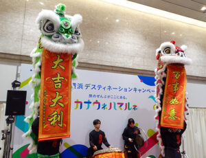 中国獅子舞による賑やかなパフォーマンスに続いて、東海大相模高校(相模原市南区)出身のお笑いコンビ「囲碁将棋」と、コンビの1人が横浜市出身の「ヨネダ2000」の2組がステージに登場。