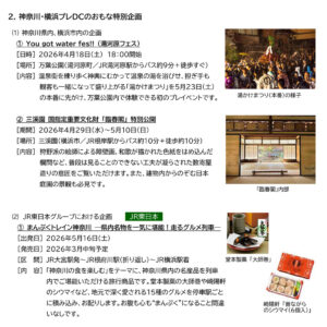 鉄道関連では「ハルシルラリー~駅からはじまる花と緑のシール旅」(4月23日~6月28日)、「よこはませんどうぶつクイズラリー2026」(4月24日~6月29日)といったラリーや、「まんぷくトレイン神奈川~県内名物を一気に堪能!走るグルメ列車」(5月16日、JR大宮駅~根府川駅(折り返し)~JR横浜駅)の運行も予定されています。