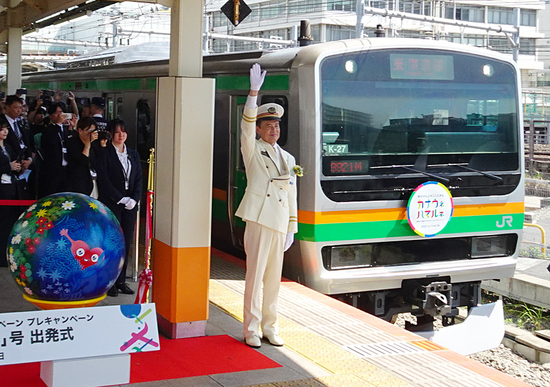 臨時列車「カナウネ ハマルネ」号に使われたヘッドマークは、6月30日まで一般の列車1編成に付けられ東海道本線や湘南新宿ラインなどで運転される。写真は出発の合図をおくるJR横浜駅の大野武一駅長(4月11日)