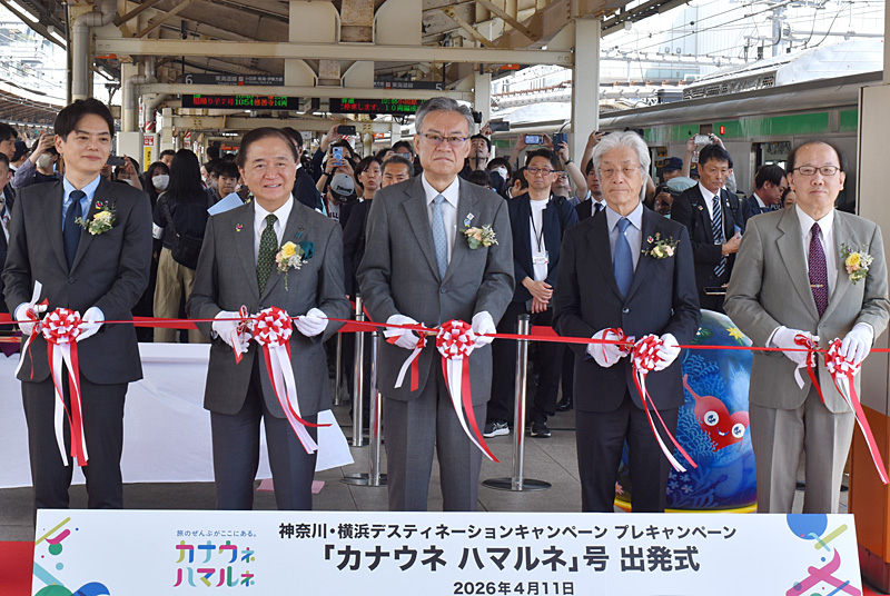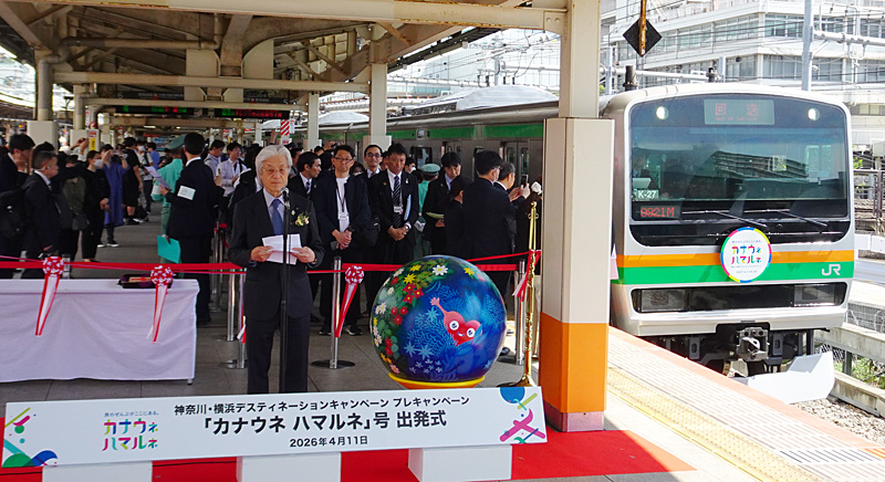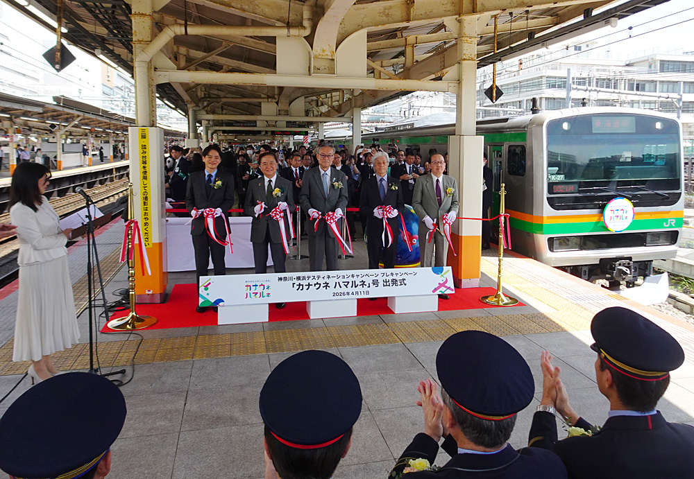 4月11日には神奈川・横浜DCプレキャンペーンのオープニング企画として、JR横浜駅から小田原駅まで東海道本線に臨時列車「カナウネ ハマルネ」号が設定され、ホーム上で出発式が行われました。