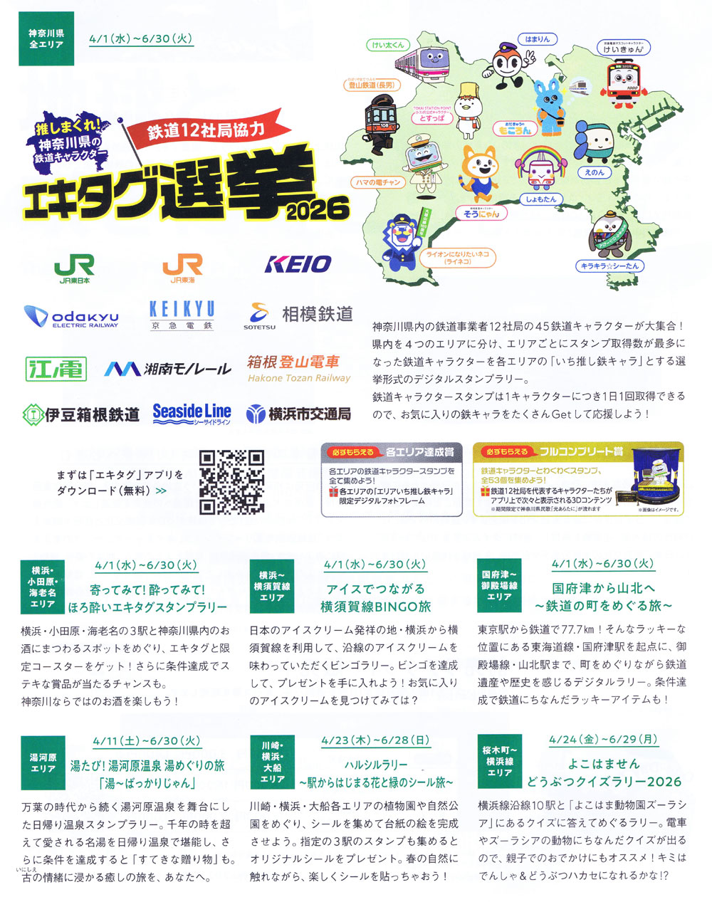 プレキャンペーン期間におけるJR東日本などによる鉄道イベントの一例、「神奈川県の鉄道キャラクターエキタグ選挙2026」は県内の鉄道12社局が共同で実施している一大企画(プレキャンペーンのパンフレットより)