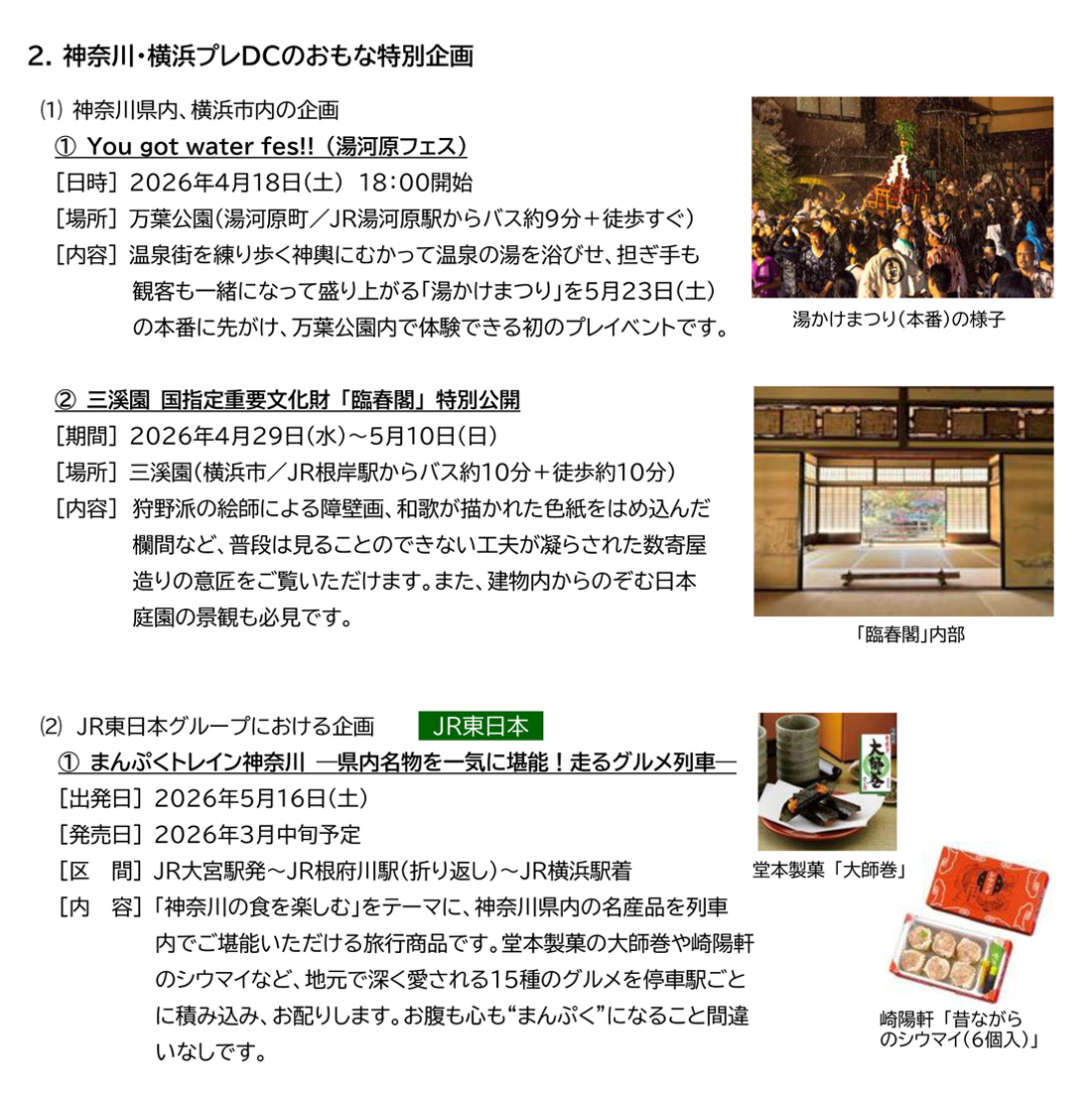 鉄道関連では「ハルシルラリー~駅からはじまる花と緑のシール旅」(4月23日~6月28日)、「よこはませんどうぶつクイズラリー2026」(4月24日~6月29日)といったラリーや、「まんぷくトレイン神奈川~県内名物を一気に堪能!走るグルメ列車」(5月16日、JR大宮駅~根府川駅(折り返し)~JR横浜駅)の運行も予定されています。